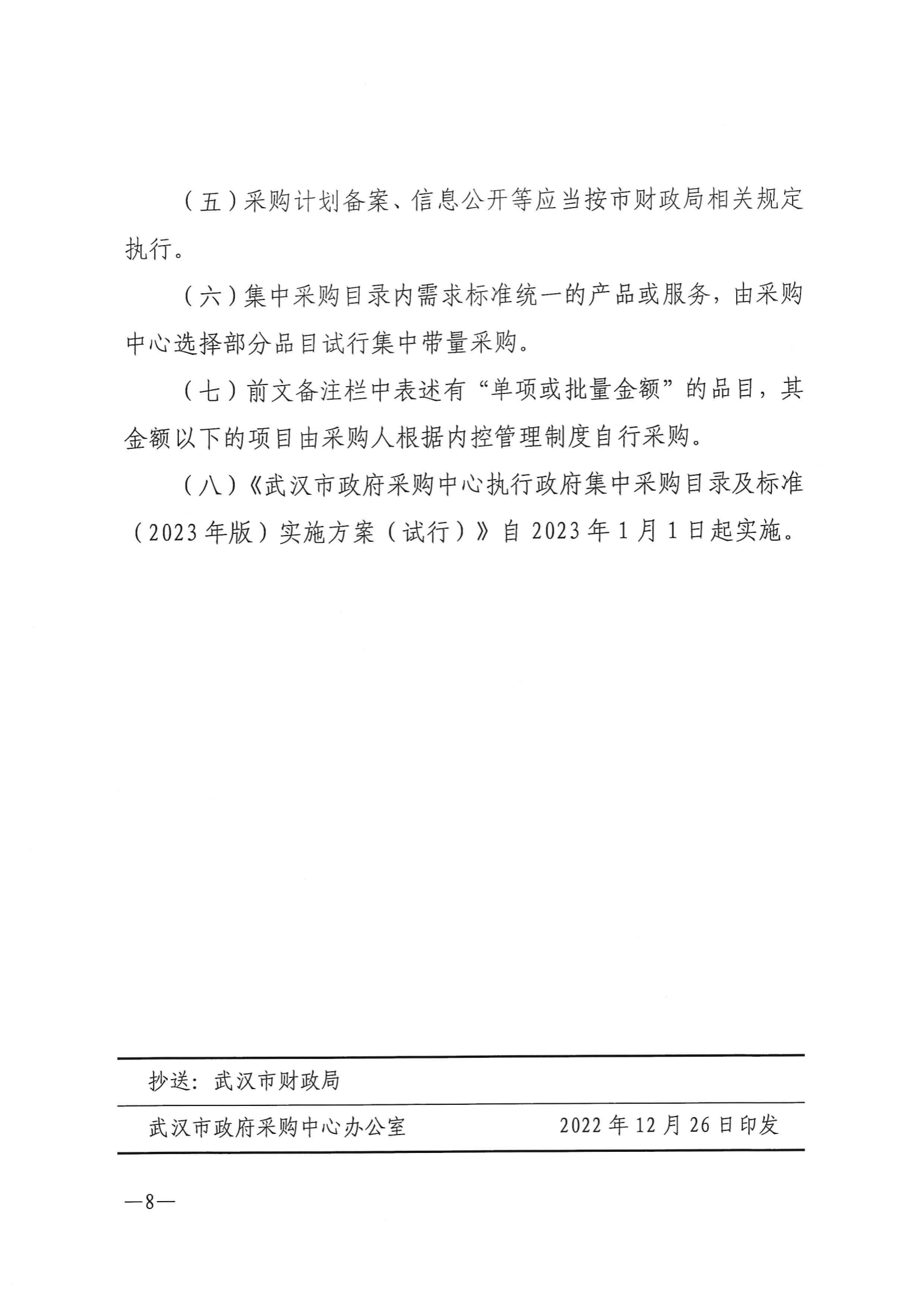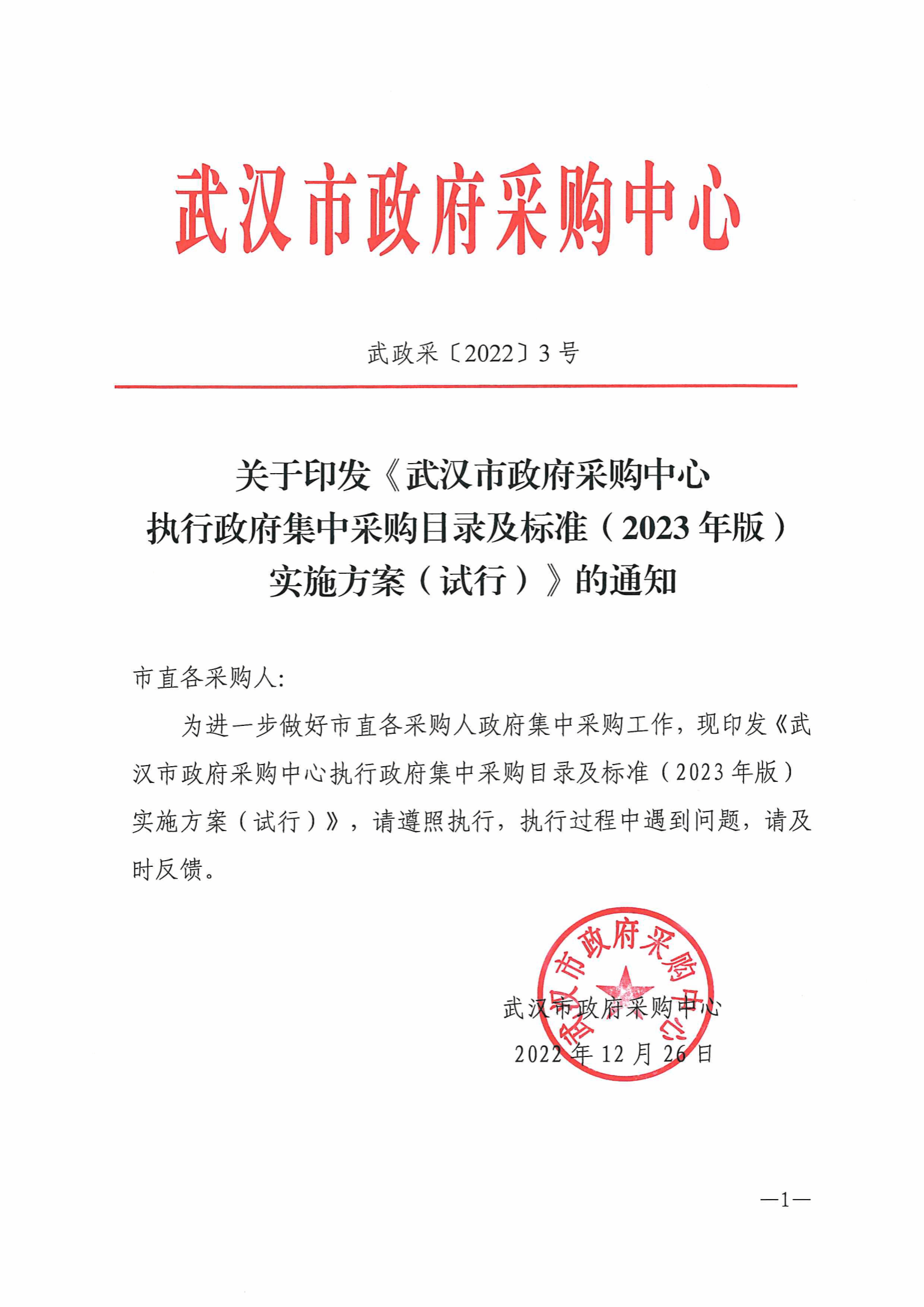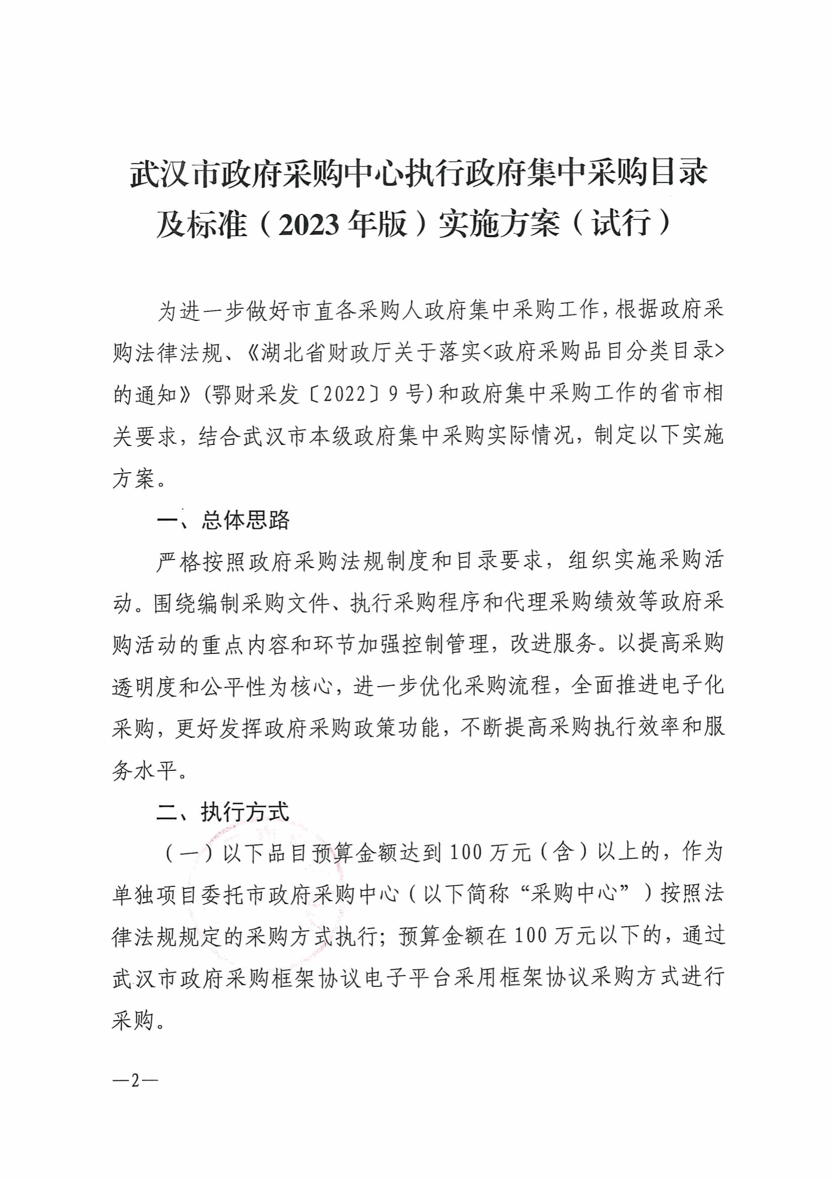 关于印发《武汉市政府采购中心执行政府集中采购目录及标准(2023年版)实施方案(试行)》的通知